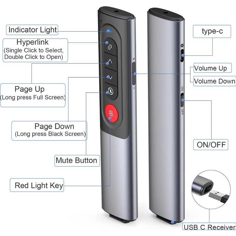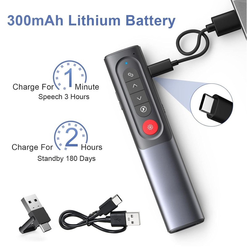 • 【What You Get】It comes with 1x Presentation Clicker Pointer Pen, 1x USB to Micro-USB charger cable, 1x User Manual, and 1x type-C charging cable. Lightweight& portable makes the laptop clicker for presentation be the nice gift for your family or friends. If any doubt of the power point slide clicker, please feel free to let us know, we will get back to you and solve the problem within 24 hours.
