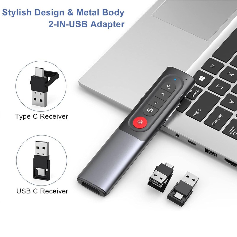 • 【Humanized Design】Stylish design& metal body 2-in-USB adapter. The bumpy design silicone buttons make you distinguish the button position of the clicker for powerpoint without looking down, which giving you a comfortable touch. At the bottom, the magnet will hold the USB receiver firmly, so you would never worry about losing the receiver after finish your presentation.