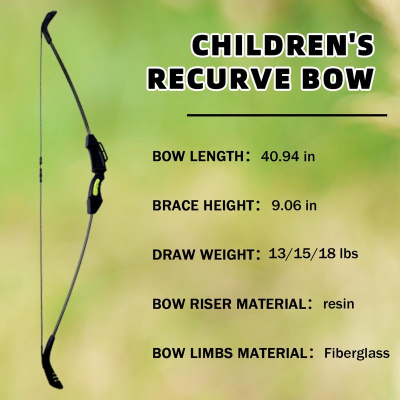 - 【Bow Data】 Bow Length: 40.94 In,Brace Height: 9.06 In, Draw Weight: 13/15/18 Ibs,Bow Riser Material: Resin,Bow Limbs Material: Fiberglass.