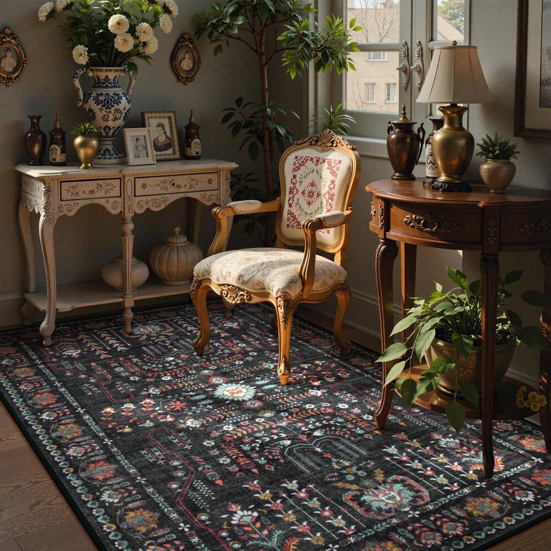 Moynesa Oriental Area Rug 3x5 Rug, Washable Kitchen Rug Non-Slip Traditional Accent Bedroom Rug, Ultra-Thin Soft Front Door Rug Indoor Boho Black Rug Carpet for Laundry Office