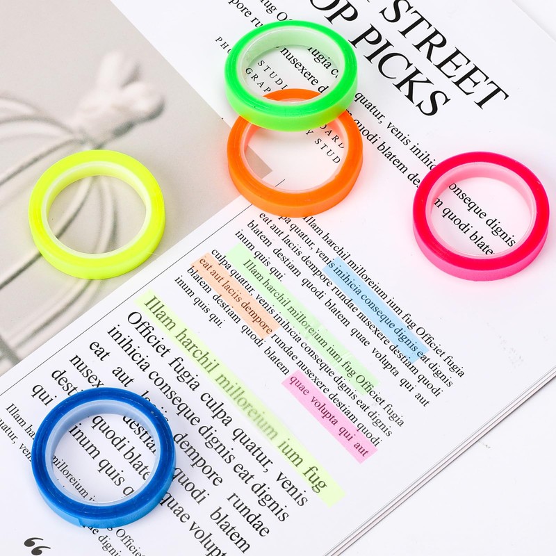 • COLORFUL AND EYE-CATCHING: This package includes 10 rolls of highlighter tapes in 5 bright and attractive colors: blue, green, orange, yellow, and rose red. Each roll measures 6 mm/0.23 in x 5 m/16.4 ft, providing ample tape for daily use and creative projects.