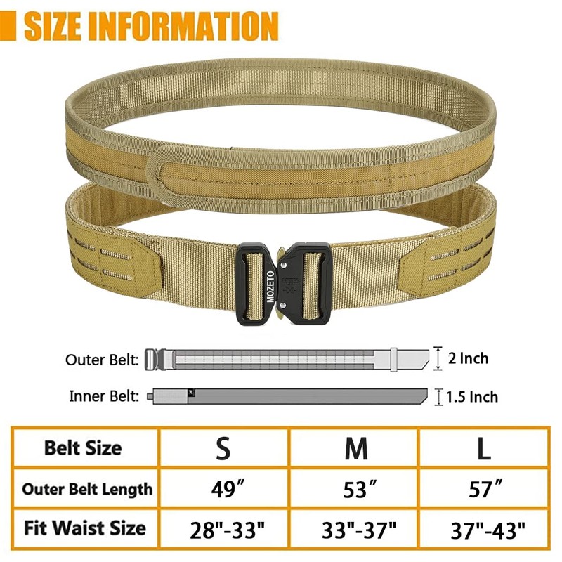 - COMFORTABLE AND ADJUSTABLE: Available in S-(28"-33"), M-(33"-37"), L-(37"-43"), our gun belt is fully adjustable with a 1.5-inch inner belt that fits most pants. The outer 2.0-inch belt quickly attaches to the inner belt to prevent movement and shifting, whether you’re hiking trails, carrying EMT gear, managing ammo pouches, or loading holsters, and ensures your belt rig stays comfortable throughout the day.