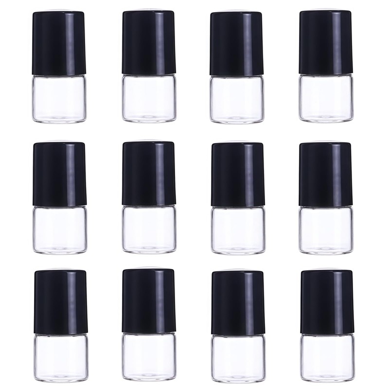Mozff 12Pcs 1ml Mini Glass Roll on Bottles Roller Refillable Essential Oil Aromatherapy Sample Vials Roller Bottles Container, Essential Oil (Black)