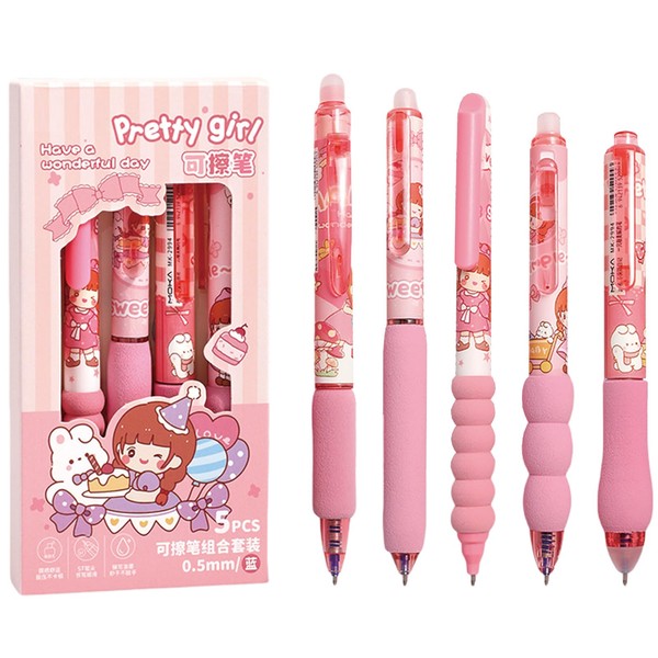 MOZXIRZ 5 Pcs Erasable Gel Pens Cute Retractable Pens Cartoon Pink Girl Writing Pen 0.5mm Blue Ink Erasable Pen for Women Girls Boys Kids Office School Supplies (Pink Girl-Blue Ink)