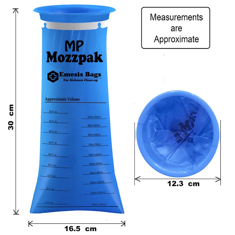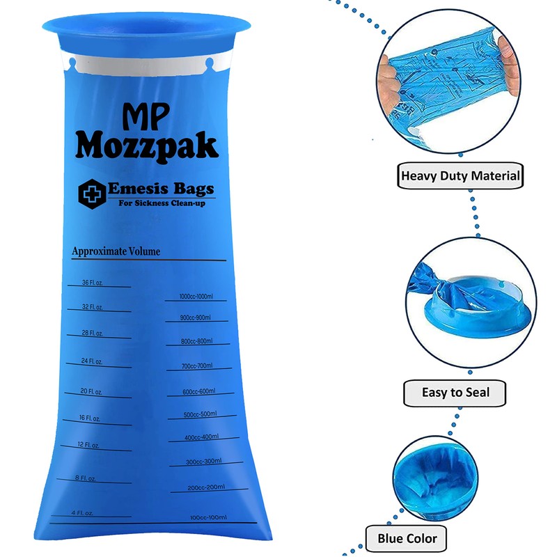 The MP Mozzpak emesis bags are blue in color. They are made of strong and hard plastic, thicker and deeper, more sturdy and hold more, no leak, securely closed, keep you away from embarrassed vomiting, TAKE ADVANTAGE of this disposable barf bags that can safely store and keep wastes away. Product Details: High Quality, Guaranteed Satisfaction Medical-Grade Barf Bags (-Pack) Heavy-Duty, Durable & Leak Resistant Portable & Compact Design Best for Car, Boat & Airplane Travel