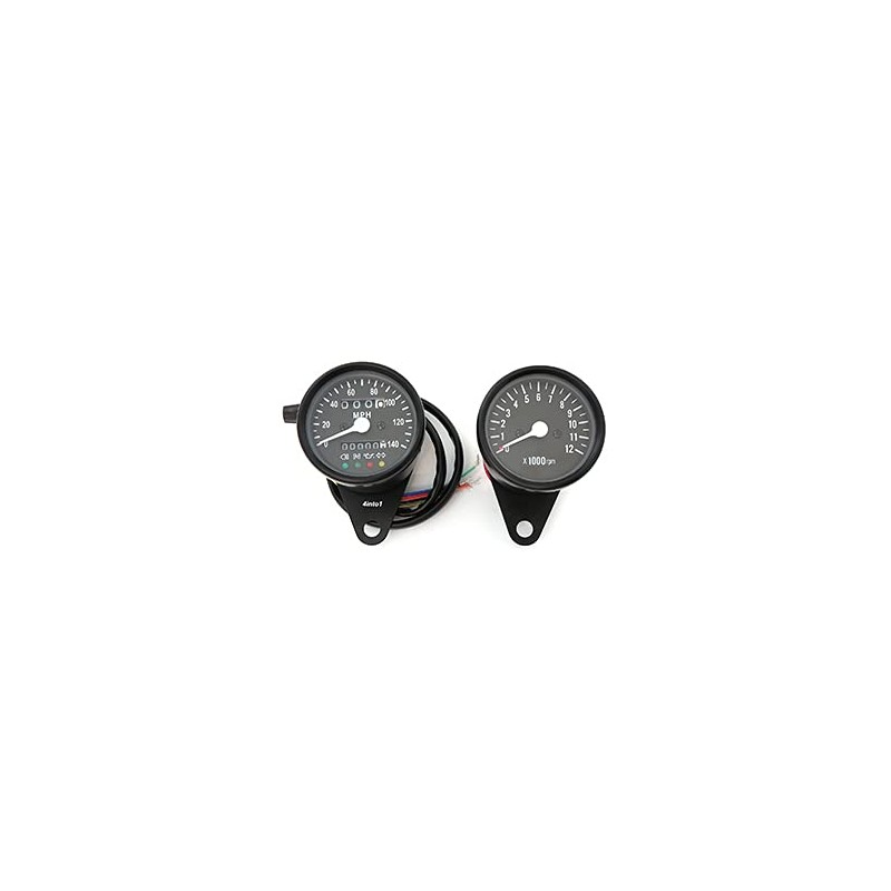 Universal mechanically driven mini speedometer and tachometer with 12V LED backlights. Perfect set for custom builds & cafe bikes with a clean minimalist look.