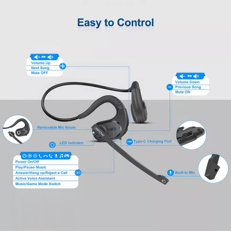 The Bluetooth headset with removable microphone weigh only 30g. The skin-friendly soft silicone ear hooks and ergonomic design, make you barely feel it on your head. The 360° aluminum alloy wire of the wireless office headset is strong and durable, tight close to the ear back that is stable without shifting or falling off. Bring your ears a comfortable wearing experience even when wearing a helmet and glasses.