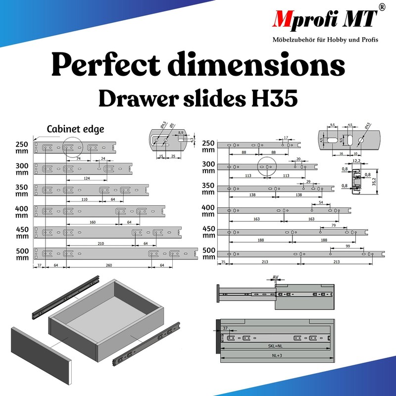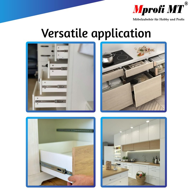 - VERSATILE USE - Mprofi MT drawer runners are extremely practical runners ideal for drawers in different applications. Drawer slides can be used in office furniture, kitchen cabinets, desks and other furniture