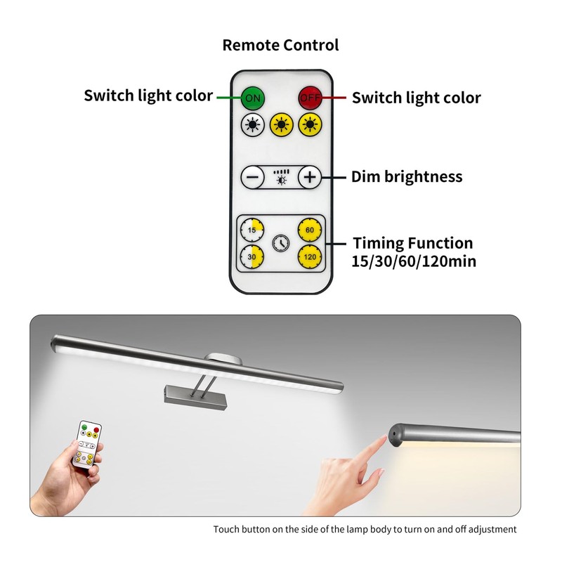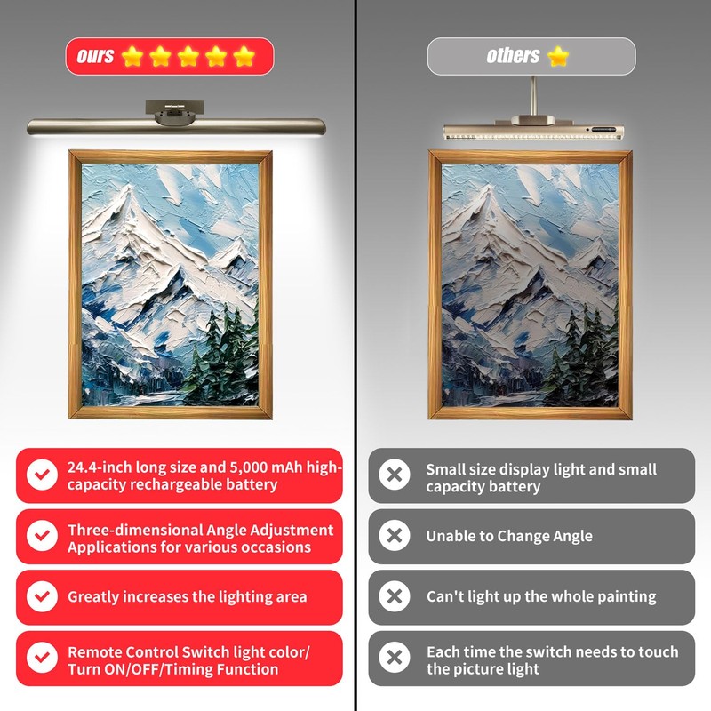- 2 Way Switch Alternative & 3 Lighting Modes Painting Lights - The wireless picture light can be operated by remote control, change the lighting modes, or touch button on the side of light bar. Both can turn ON/OFF, changing color, adjust brightness.The painting light can be switched by 3 lighting modes with 3000k/4500k/6500k (Warm /Nature/White light), remote control or touch button operate.
