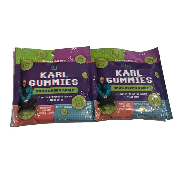 Contains one (2) 50-gram bag of Feastables Karl Gummy Candy Sour Green Apple, perfect snack size to meet your cravings on-the-go!