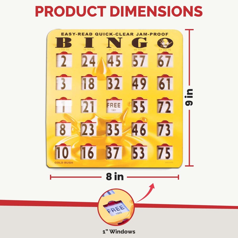 MR CHIPS Jam-Proof Easy-Read Quick-Clear Large Print Fingertip Slide Bingo Cards with Sliding Windows - 25 Pack in Gold Rush Style