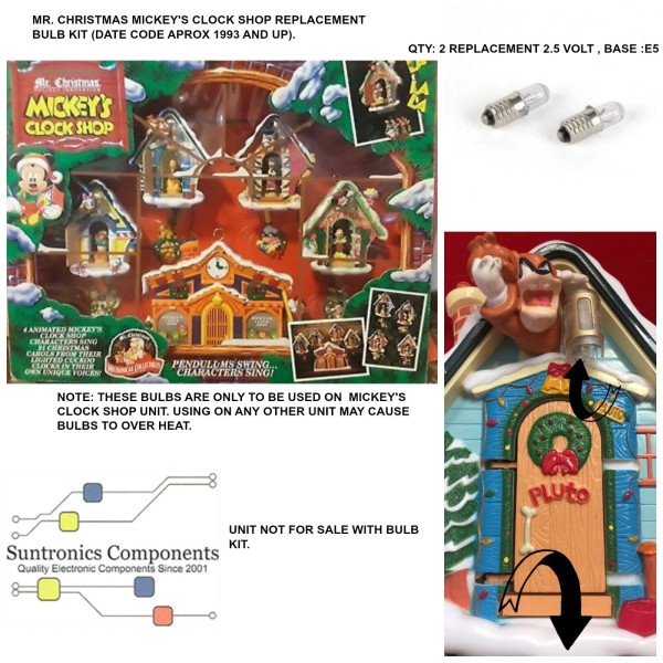 (TWO NEW FILAMENT BULBS PER KIT) NEED TO REPAIR YOUR MR.CHRISTMAS 1993 AND UP DATE CODE MICKEY'S CLOCK SHOP. OUR COMPANY HAS PUT TOGETHER A VERY GOOD HIGH QUAILTY REPLACEMENT BULBS FOR THE UPPER AND LOWER LIGHTS.