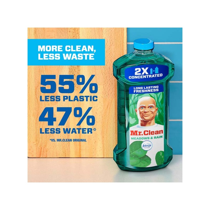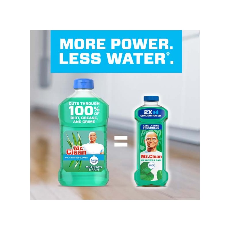 Mr. Clean’s Multi-Surface Cleaner with Febreze Meadows and Rain scent is an all-purpose cleaner. Use it for: