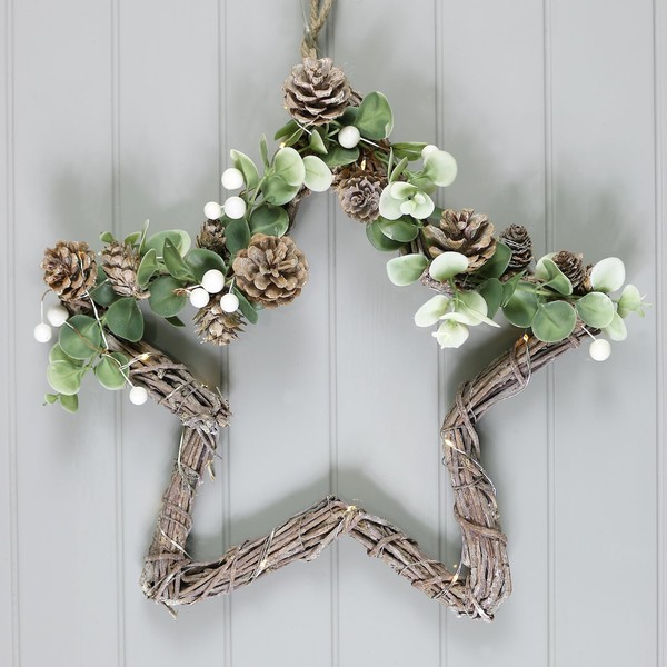 Emanate the festive allure of the season with the Light Up Twig Christmas Star. Crafted with intricate snowberries, pine cones, and eucalyptus leaves, it bathes your space in a warm, enchanting radiance. Battery-operated and elegantly designed, it's the perfect addition to your indoor decor, whether on your porch or hallway.