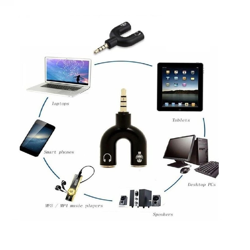 3.5mm male to 2 dual female 3.5mm jack AUX audio mic earphone converter adapter. A special U shape that allows you to connect two 3.5mm jacks at the time. Works perfect on all devices with 3.5mm port: cellphones, computer, MP3 players, Headphones, stereo and more.