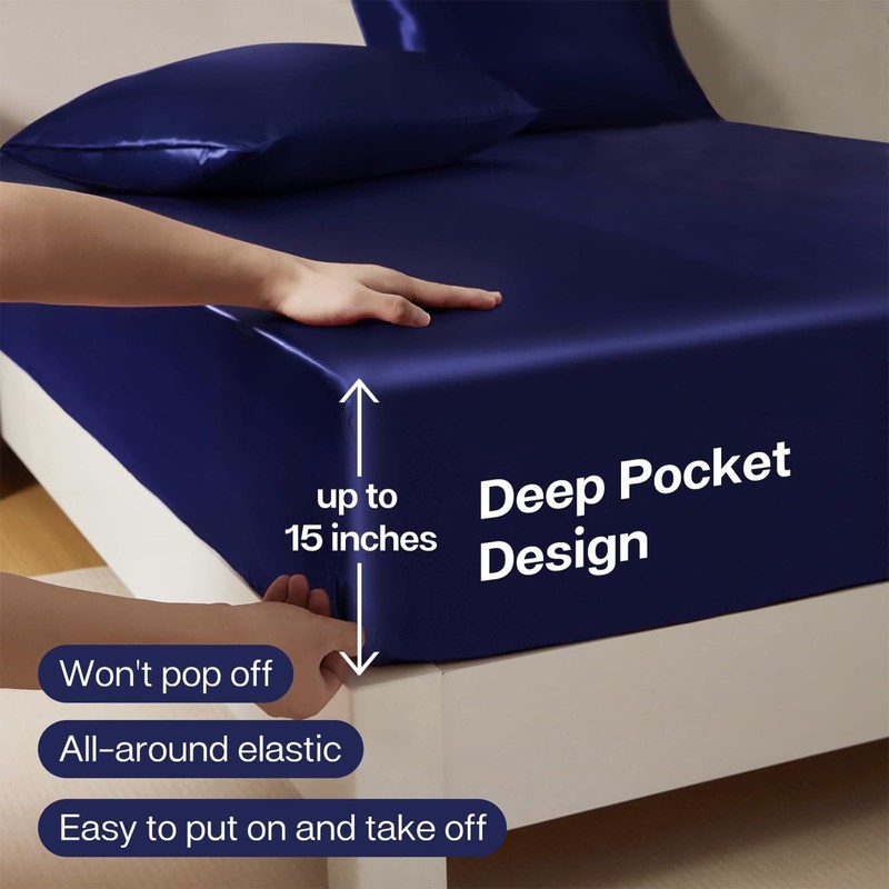 MR&HM Satin Fitted Sheet & Pillowcase Set King Size, 3-Piece Silky Soft Bedding with 15" Deep Pocket, Reinforced Elastic Corner Straps to Prevent Slipping Off Mattress, Navy Blue