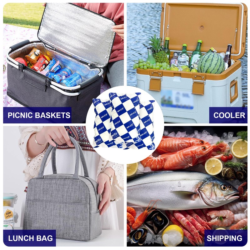 1. Reusable Ice Packs for Cooler, 5 ply construction, flexible when frozen, can be cut or folded to fit around products or in containers.