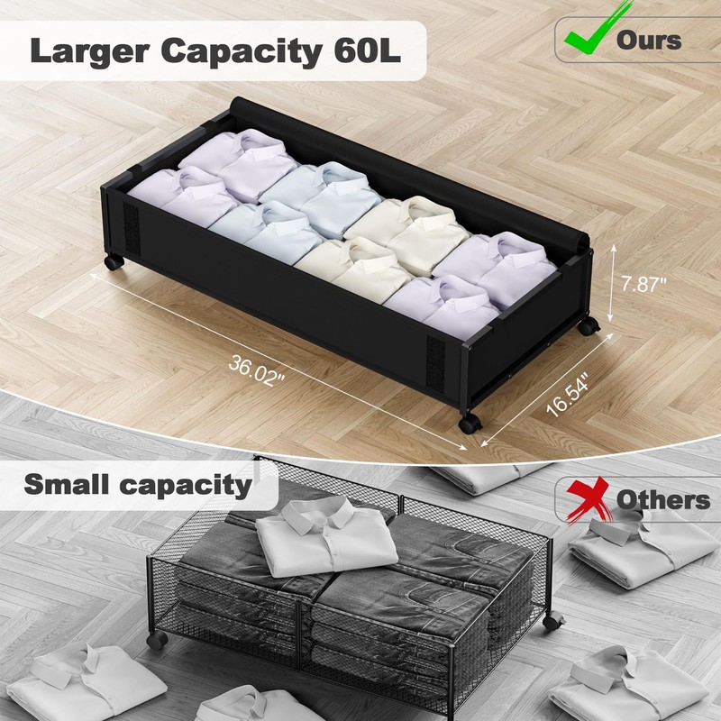 - Upgraded Larger Capacity: Mr IRONSTONE under bed storage containers measuring 36.02"Lx16.54"Wx7.87"H(with Wheels)/6.3"H (without Wheels). Large capacity of 60L, significantly larger than most under bed storage on the market, allowing you to make good use of the lower space under the bed, sofa, wardrobe, or table. By utilizing underutilized space, make your room feel bigger.
