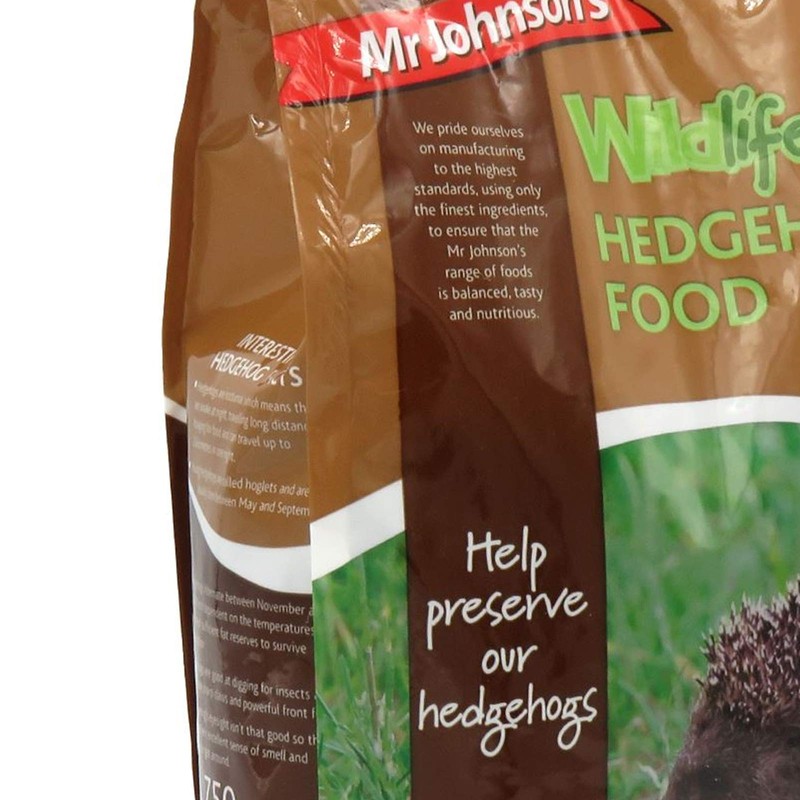 Product descriptionMr Johnsons Wildlife Hedgehog Food 750G Pack Of 6IndicationsHedgehog feeding, Complementary food for hedgehogsDirectionsServe as complementary food for hedgehogs