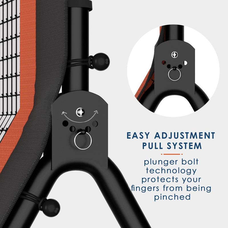 - QUNIQUE ALL IN 1 DESIGN– Easy adjustment pull system lets you adjust the angle for high pops, grounders and line drives in seconds while plunger bolt technology protects your fingers from being pinched when adjusting the rebounder, and more, the height of our multi-functional rebounder can be lowered as well to make it a real all-in-one practice accessary for any type of sports.