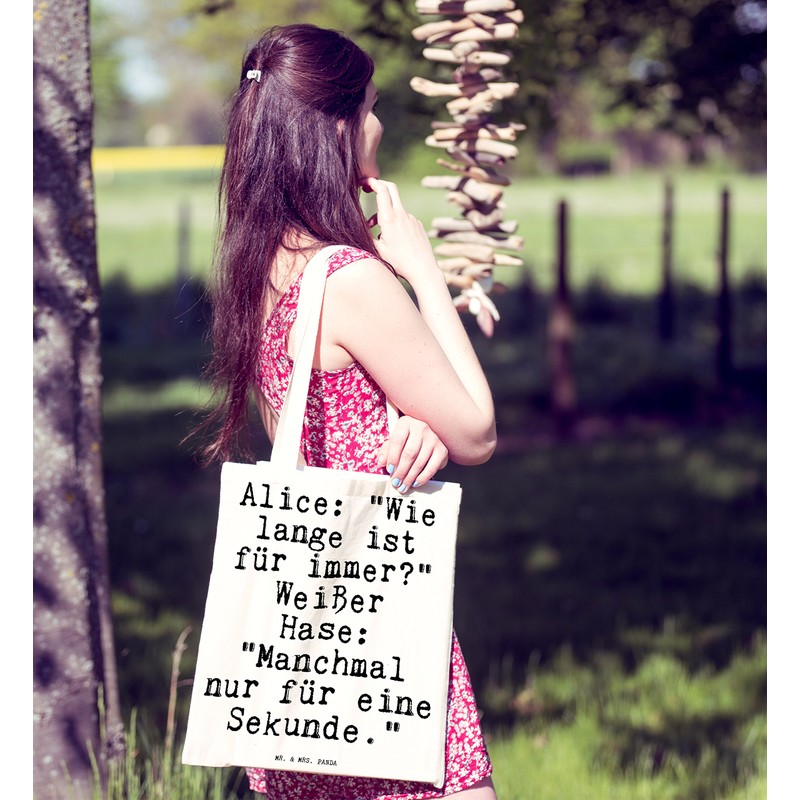 Mr. & Mrs. Panda Alice: Wie Lange ist... - Gift, Lewis Carroll, Fabric Bag, Quote, Saying, Jute Bag, Wisdoms, Sayings, Alice in Wonderland, Shoulder Bag, Jute Bag, White, Hand Drawn