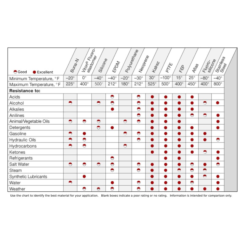 • These versatile o-rings perform well in petroleum based oils & fuels, aliphatic hydrocarbons, vegetable oils, silicone oils & greases, ethylene glycol, dilute acids, and water to below 100°C (212°F)