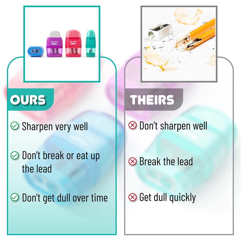 - Mr. Pen pencil sharpener & eraser set is made of hard and light plastic. The inside blades are made of quality metal with a sharp edge; they do not easily rust and will not hurt children's hands, so they can be used with confidence. The top eraser is latex-free and has a lid that keeps it clean.