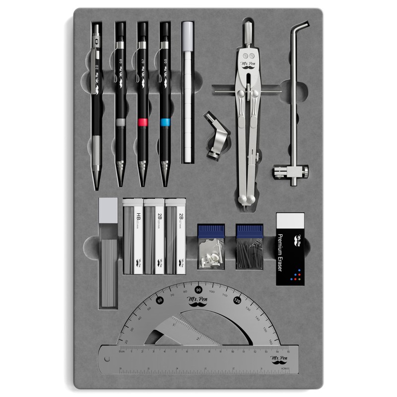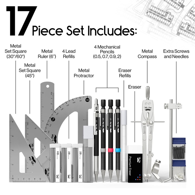 Mr. Pen- Professional Geometry Set, 17 pcs, Silver Geometry Kit for Artists, Metal Rulers and Compasses, Mechanical Pencil Set, Drafting Tools & Drafting kits