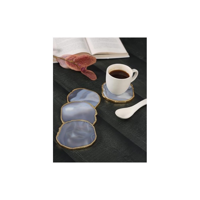 - The ideal gift Four gorgeous salt-Grey agate stone coasters in one set. 3.5"–4" in size, ideal for beverages, with a vivid gold border. A cute and stylish present for any occasion, or just for yourself!