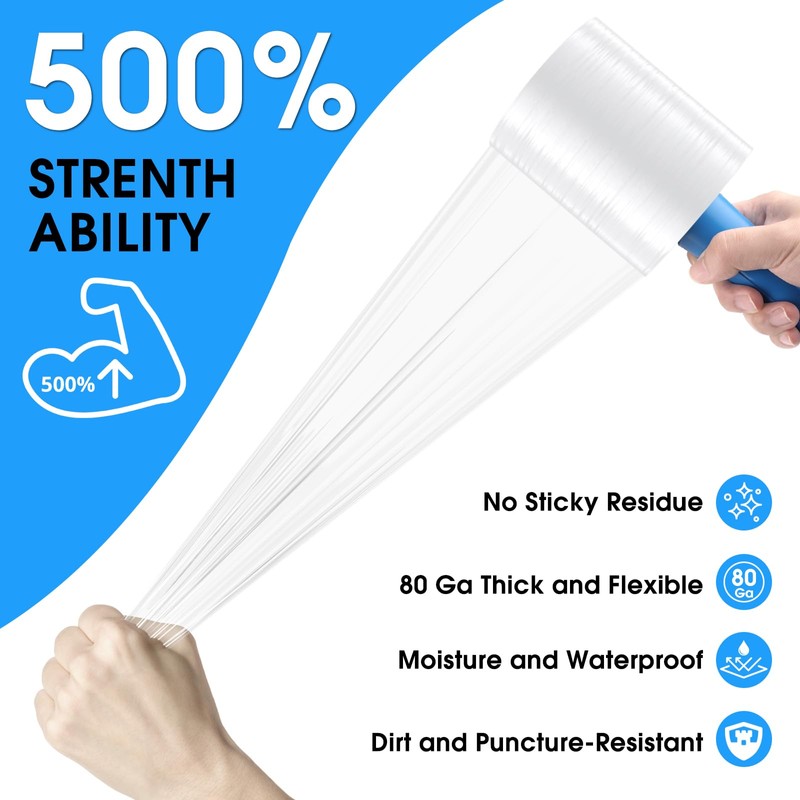 - UP TO 500% STRETCH ABILITY: This shrink wrap roll is highly stretchable, with a stretch ratio of up to 500%, allowing for more items to be packaged using less material. It is more economical and easy to use than tapes, strapping, etc. It's the economic and endurable stretch wrap roll for all weather conditions.