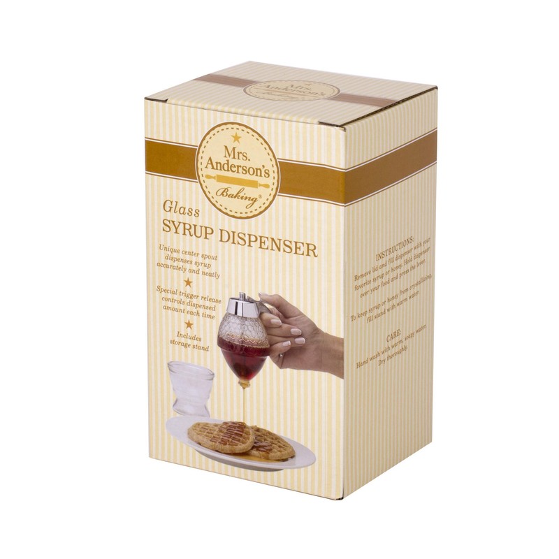 - Mrs. Anderson’s Glass Syrup Dispenser with storage stand for storing and dispensing syrups and honey without a sticky, drippy mess