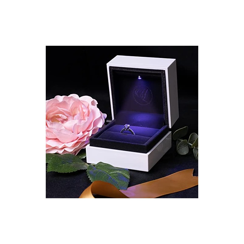 - SHOWCASE DISPLAY: Get a box worthy of the ring. This elegant luxury display lights up your ring against soft black velvet to let diamonds and gemstones sparkle. The white modern outer casing is finished to a glossy shine for the perfect presentation from start to finish!