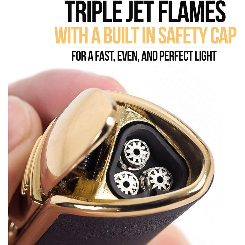- TORCH CIGAR LIGHTER: Adjustable triple jet flames for an even burn with safety cover cap that automatically opens when lighting.