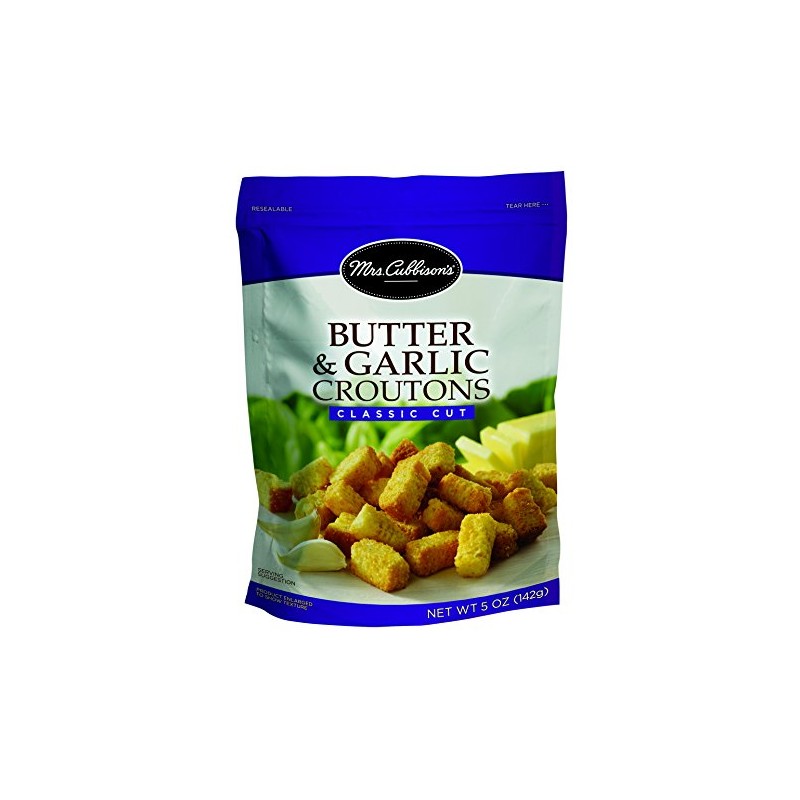 - Our Mrs. Cubbison's croutons butter & garlic flavor comes in 5 ounce bag pack of 9. Also available in asiago cheese ciabatta, tuscan herb focaccia, asiago cheese ciabatta, caesar salad flavor and many more.