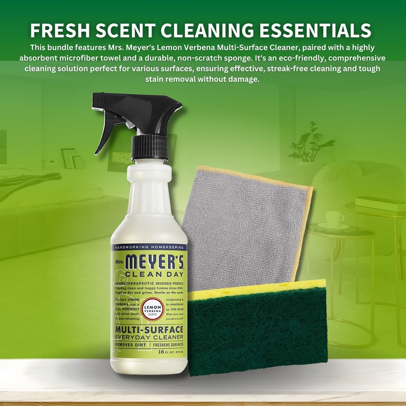 - CLEANING BUNDLE: Our multi-purpose cleaner spray bundle features a 16-ounce bottle of Mrs Meyers All-Purpose Lemon Verbena Cleaning Spray paired with a pack of 5 reusanle wipes. Tackle both new and old stains effortlessly with our kit.
