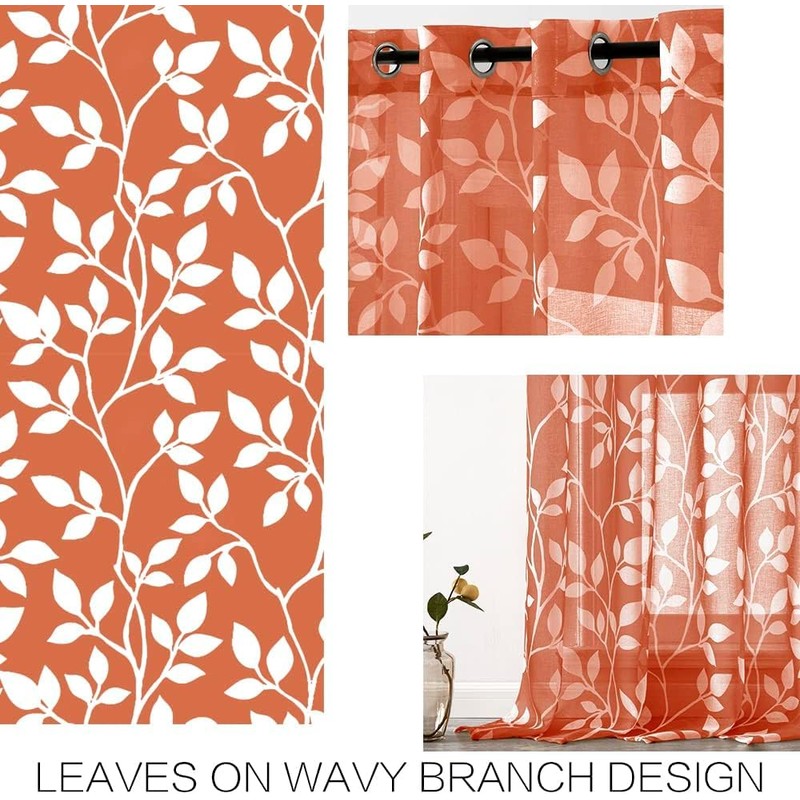 MRTREES Curtains with Eyelets Transparent Orange Red for Living Room Bedroom Modern, Voile Curtains with Pattern White Leaf Print Set of 2, 225 cm Long, 140 cm Wide, Living Room Curtains