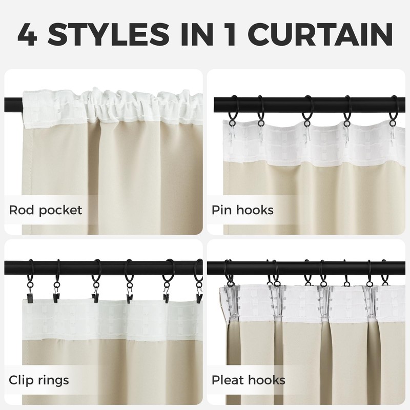 - Mehrere Aufhängemethoden: Dieser Vorhang unterstützt drei Aufhängemethoden, nämlich Kräuselband, Aufhängeringe und Stangentaschen. Sie können je nach dem Stil der Gardinenstange und dem Stil der Hausdekoration flexibel die am besten geeignete Aufhängemethode wählen, um Ihre verschiedenen dekorativen Bedürfnisse und persönlichen Anforderungen zu erfüllen