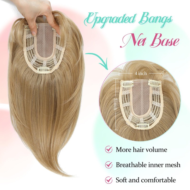 Ms Taj 12 Inch Hair Topper with Bangs, 360° Cover Synthetic Clip in Bangs, 4"x5" Bangs Natural Straight Fiber Hair Toppers for Women, Breathable & Comfortable for Daily Wear(Champagne Blonde)