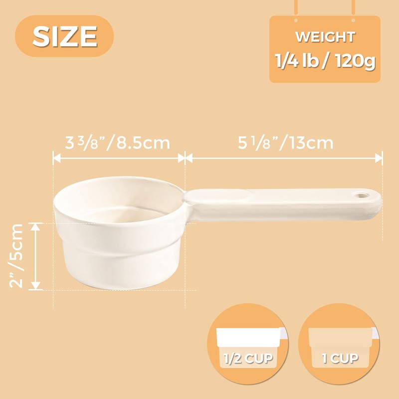 - 【1 Cup Capacity】The pet food scoop measures 1-cup capacity with 1/2 cup measurement marked. It is used to measure pet food proportion exactly to make a standard diet.