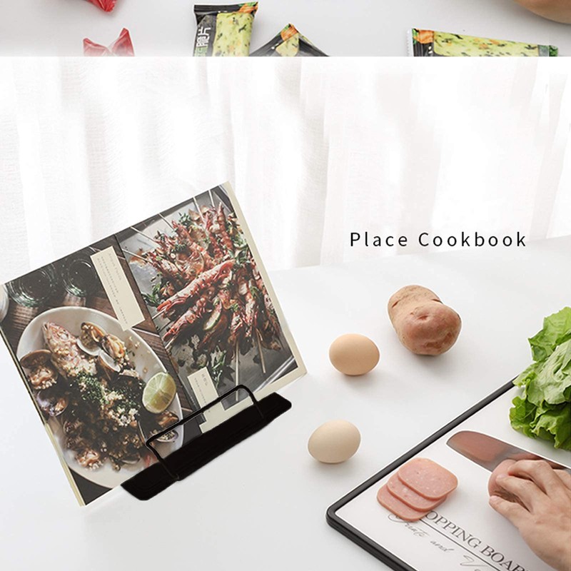 - 6 Adjustable Reading Positions Recipe Stand: Length-7.3in, Width-7.8in. The cookbook holder is adjustable with various notches at the movable rear back stand, which makes you can adjust the height and angle according to your need. Promotes proper posture for better spinal health.