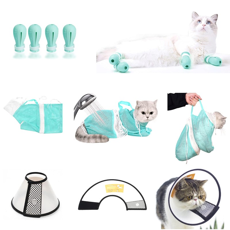 MSMUOEZ 7 Pieces of Cat Bathing Supplies,Anti-Scratch Silicone Cat Shoes,Cat Claw Covers, Cat Shower Net Bag,Cat Bathing Bag,Cat Grooming Mesh Bag,Elizabethan Collar(No.3)
