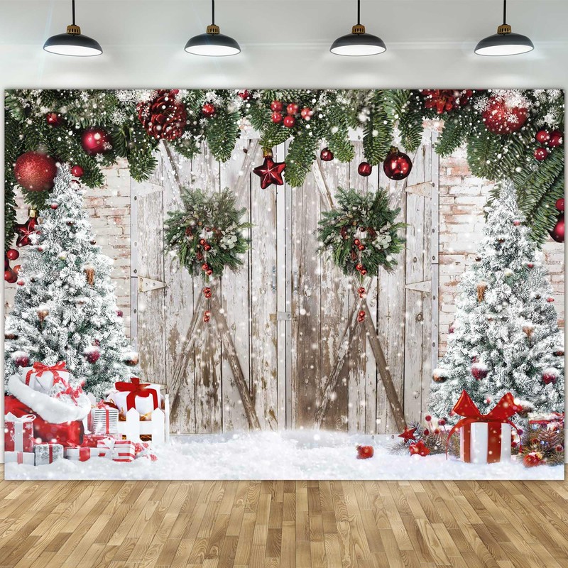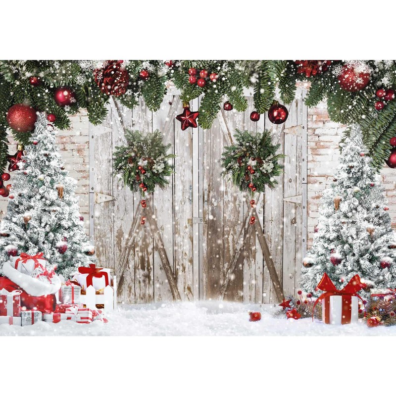 Msocio 10x8ft Polyester Christmas Photography Backdrop Winter White Barn Wood Door Brick Wall Christmas Tree Background for Xmas Festival New Year Holiday Party Decoration Banner Photo Studio Props