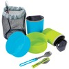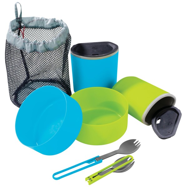 - Includes 2 Insulated Mugs, 2 Deep Dish Bowls, 2 Folding Sporks, Mesh Bag