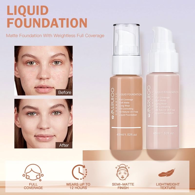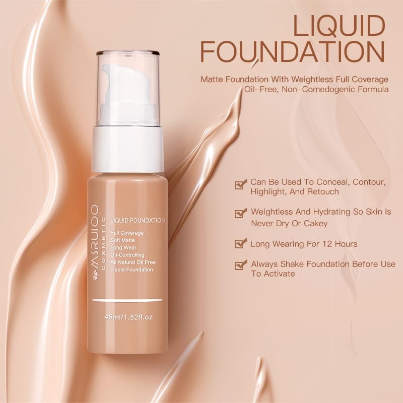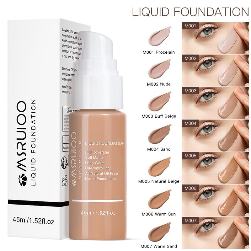 MSRUIOO Liquid Foundation, Matte Finish, Weightless Full Coverage, Oil-Free, Non-Comedogenic, 1.52 fl oz (M005, 1pc)