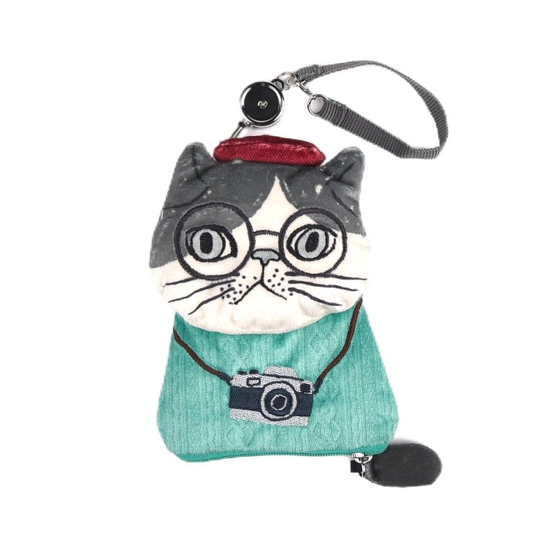 - シナモンの顔型パスケース付きポーチ。伸びるリール付きなので改札もラクラク。