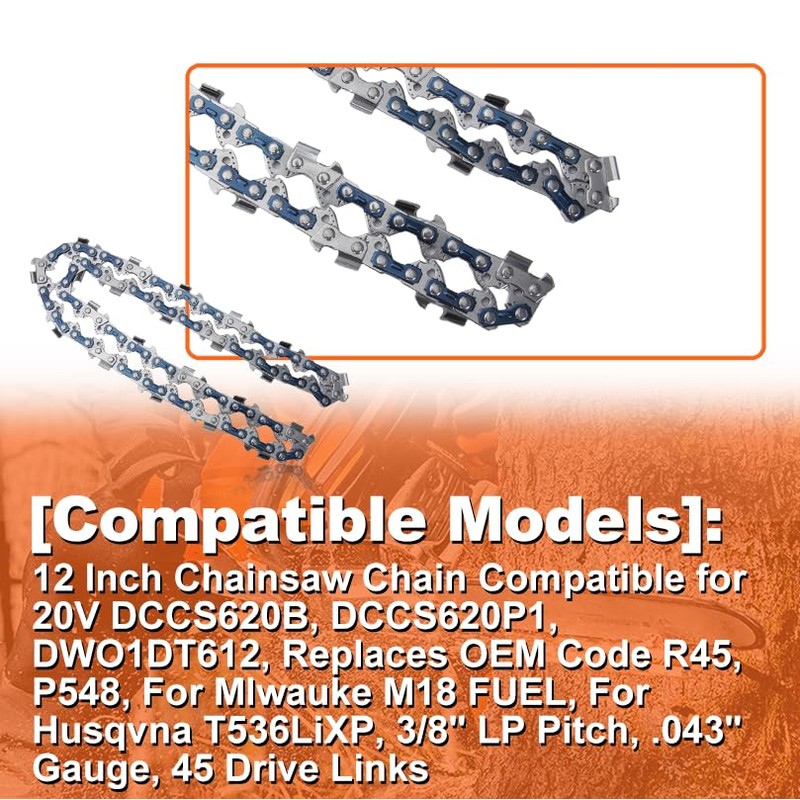 - Premium Replacement Chain for Multiple Models – This 12 inch chainsaw chain is expertly engineered to fit For DCCS620B, For DCCS620P1, For DWO1DT612, and For P548 18V Lithium chainsaws, as well as For Mlwauke M18 FUEL and Replaces OEM Code R45 and For Husqvna models such as 536LiXP, T536LiXP, T435, T540, 128LDX, 325P4, and more. Check compatibility before ordering to ensure a perfect fit!