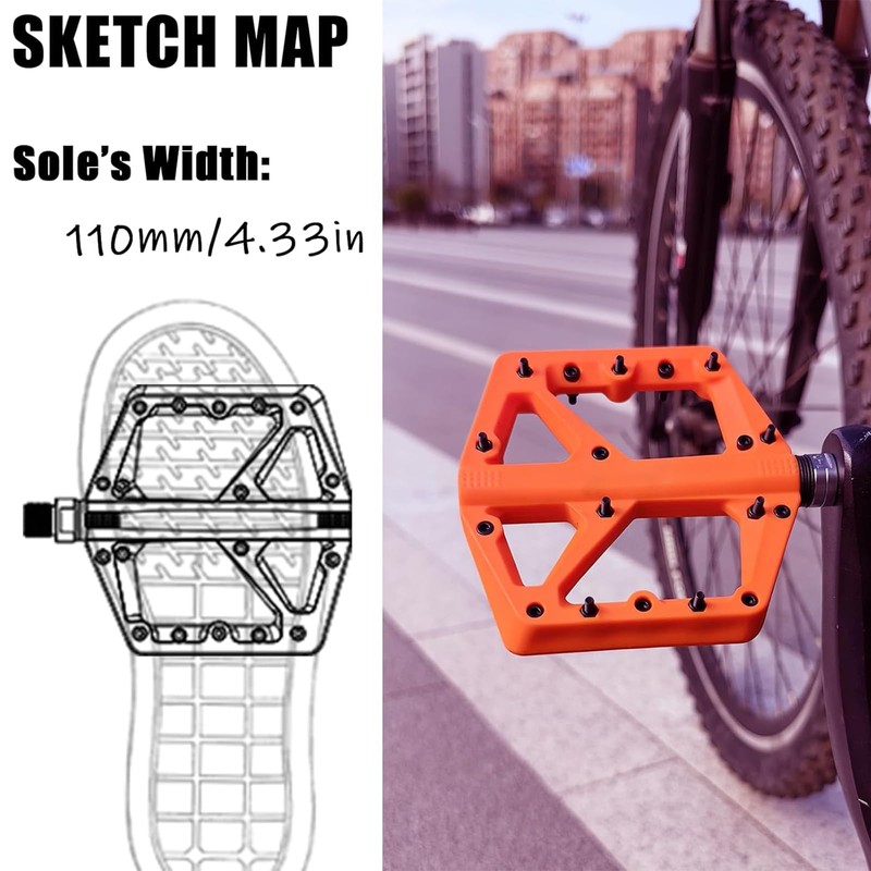 • 【WIDE TREAD & EXCELLENT GRIP】Our mountain bike pedals feature a large 12.4 cm (4.88”) flat surface, designed to accommodate most shoe sizes comfortably. The non-slip design includes 9 replaceable pins per side, ensuring a secure grip on your shoes. Enjoy a more stable and comfortable cycling experience with enhanced traction and control.