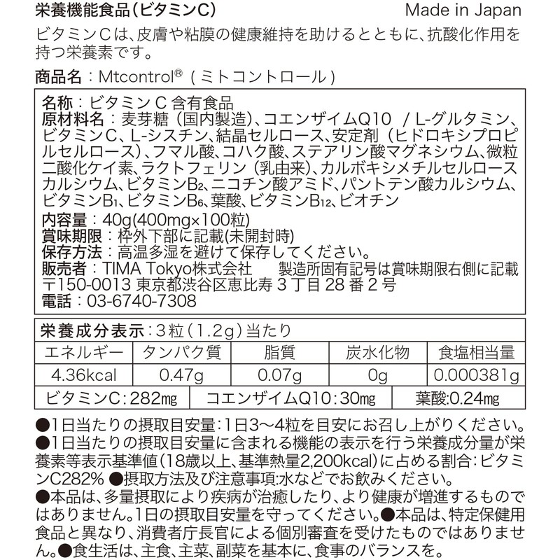 Mtcontrol [ ミトコントロール] ミトコンドリアサプリメント 無添加 (100粒入り1袋:目安30日分) ビタミン アミノ酸 葉酸 ラクトフェリン 15種類の有用成分配合 美容 健康 犬房春彦 開発
