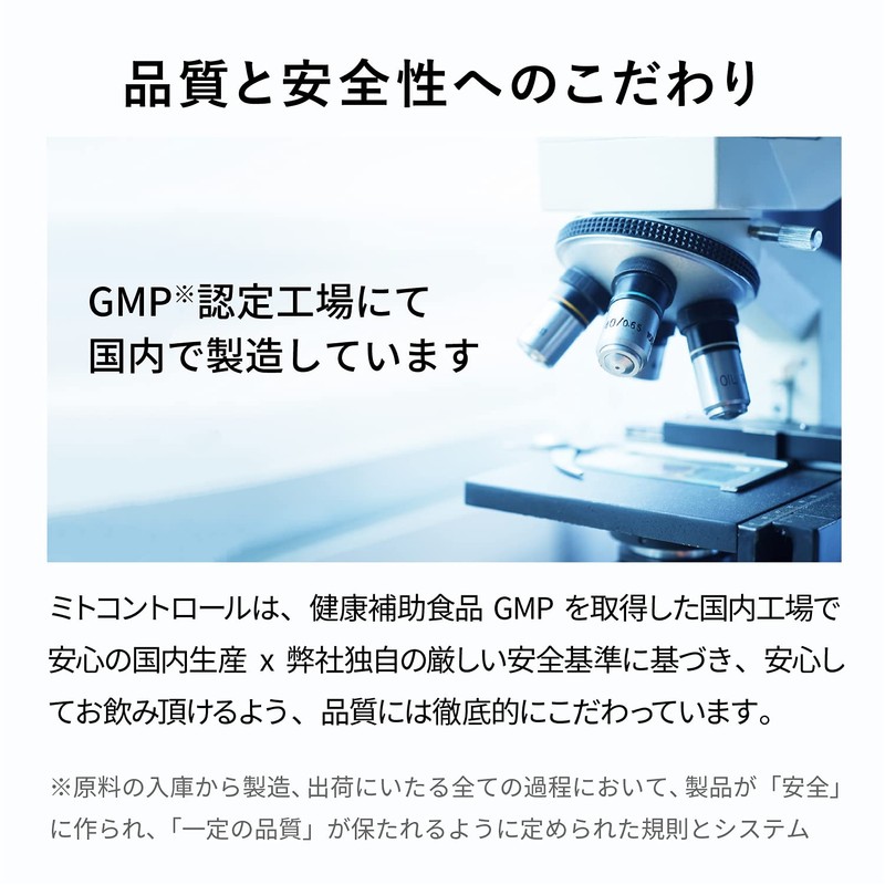 • 【甘味料、保存料など添加物不使用】ミトコントロールは厳しい品質基準をクリアした、安全性と品質が保証されている原料のみを使用しております。配合されている有用成分は、もともと私たちの体の中にあるものですので、安心してお召し上がりください。