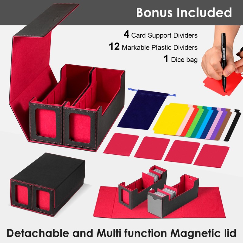 • ● DETAIL-ORIENTED: Inside the display window of the mtg deck box commander, there's a handy Half Moon Fingertip Slot, making it a breeze to grab your cards! This trading card storage is a feast for the eyes with 12 markable vibrant dividers! Plus, each magic card storage box includes a luxurious velvet bag to keep your game dice organized. But wait, there’s more! The card storage comes equipped with 4 adjustable dividers, perfect for slipping into the slots to suit all your needs!